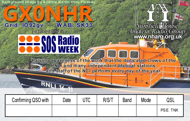Throughout the month on May, NHARG will be taking part in the SOS Radio Week, to raise awareness of the work of the volunteer Royal National Lifeboat Institution (RNLI) and independent lifeboat crews and National Coastwatch Institution (NCI) watch-keepers. We will post on the calendar of when planned activities from the shack will take place.